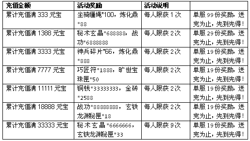 2.活动期间,玩家在指定时间内充值一定数额的元宝,即可获得系统赠送的奖励。
